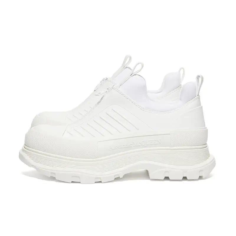 The Alexander McQueen Oversized White Black sneaker a rounded rubber toe as well as a rubber sole. The majority of the shoe is a bright white color. On the heel of the shoe, there are black details. The shoe also has perforated air holes in order to help make them be more breathable. The Alexander McQueen Oversized White Black also has white laces.