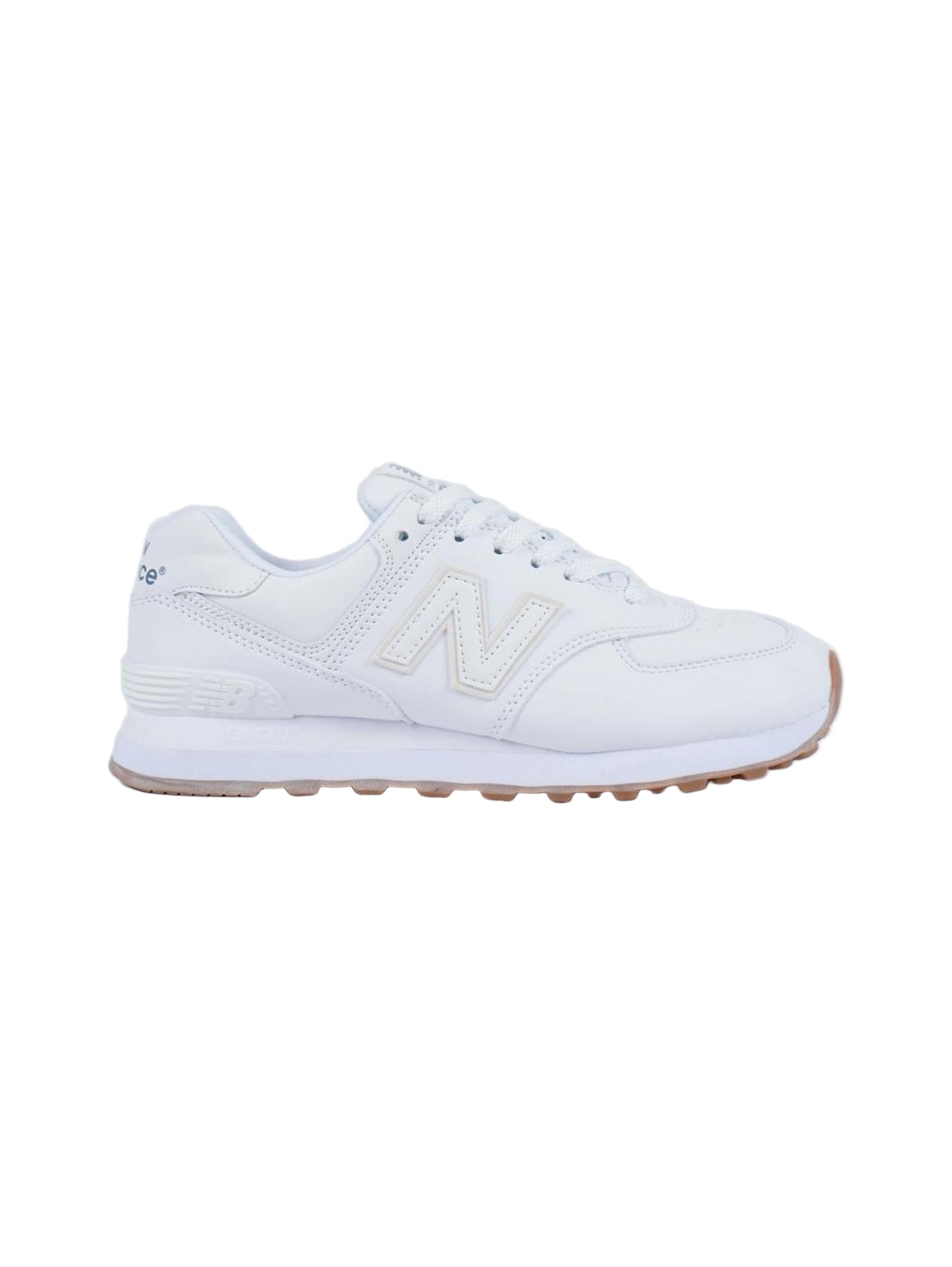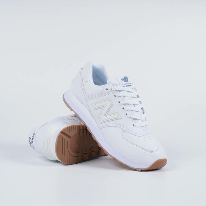 This is a pair of white New Balance 574 sneakers featuring ENCAP midsole cushioning for comfort and support