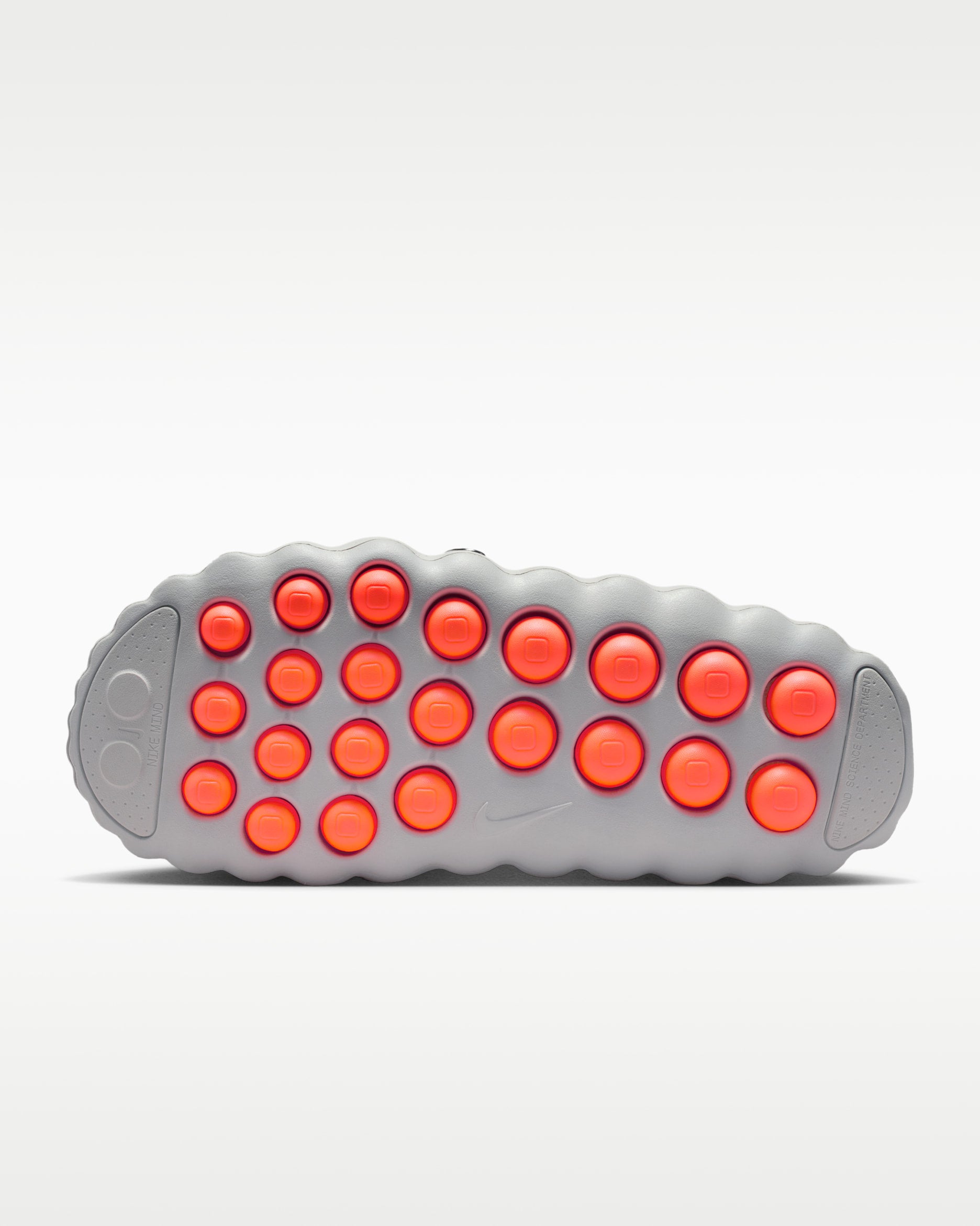 This is a pair of Nike Mind 001 mules in the Light Bone, Chrome, and Hyper Crimson colorway.